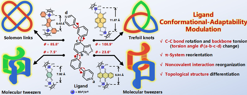 Ligand conformational adaptability modulated self-assembly of Solomon links (4_1^2) and trefoil knots (3_1)